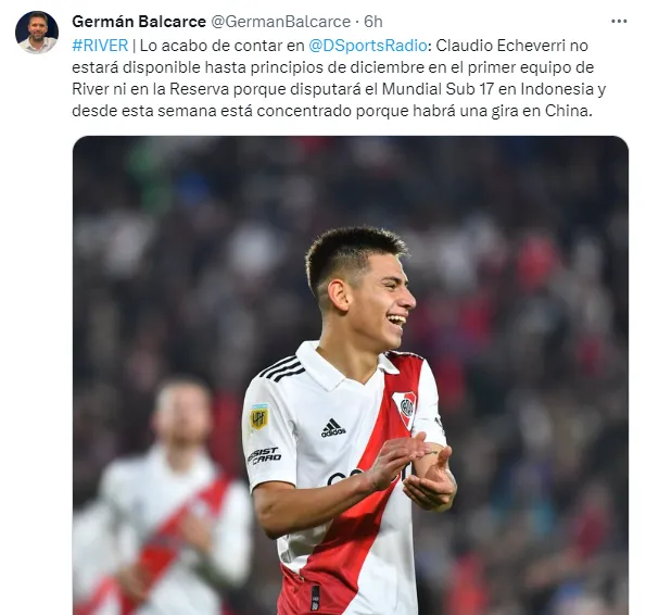 Acorde a lo que informó el periodista Germán Balcarce en D Sports Radio, Claudio Echeverri no estará disponible hasta principios de diciembre en el primer equipo de River ni en la Reserva porque disputará el Mundial Sub 17 en Indonesia y desde esta semana está concentrado porque habrá una gira en China.