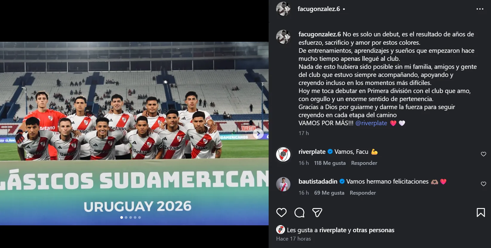 A través de su cuenta de Instagram, Facundo González compartió un emotivo mensaje: “No es solo un debut, es el resultado de años de esfuerzo, sacrificio y amor por estos colores. De entrenamientos, aprendizajes y sueños que empezaron hace mucho tiempo apenas llegué al club. Nada de esto hubiera sido posible sin mi familia, amigos y gente del club que estuvo siempre acompañando, apoyando y creyendo incluso en los momentos más difíciles”.