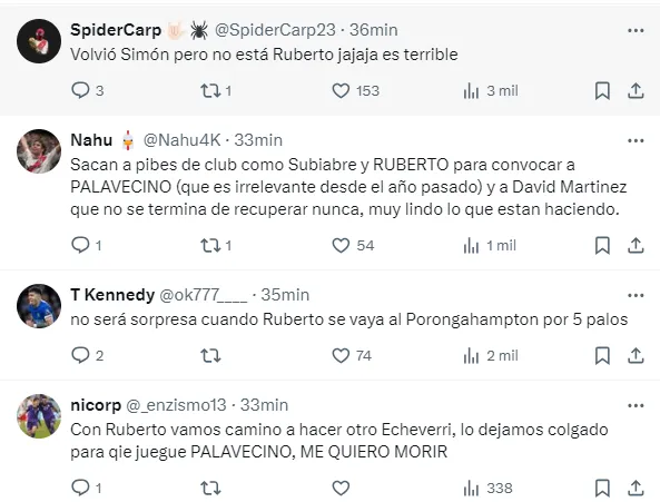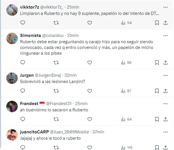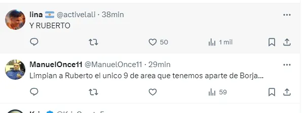 “Limpiaron a Ruberto y no hay 9 suplente, papelón lo del intento de DT”, “ah buenísimo lo sacaron a Ruberto”, “Jajajaj y ahora le tocó a ruberto”, “Ruberto? un pibito que limpian fácil”, fueron algunos de los tantos comentarios de los fanáticos del elenco de Núñez molestos por la ausencia del juvenil.