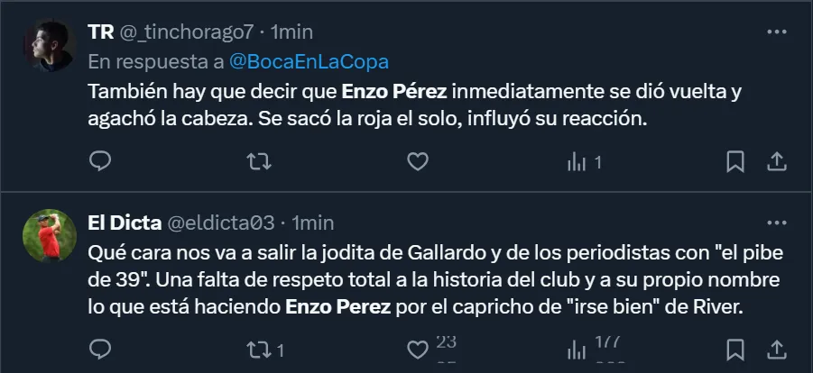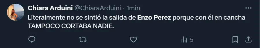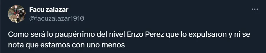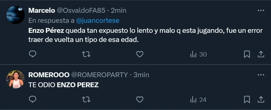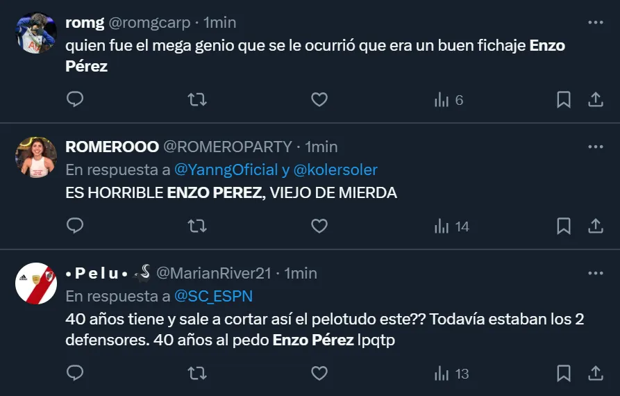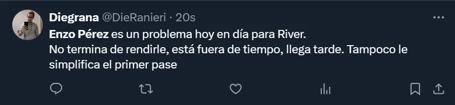 “Enzo Pérez es un problema hoy en día para River. No termina de rendirle, está fuera de tiempo, llega tarde. Tampoco le simplifica el primer pase”, esbozó el usuario de Twitter @DieRanieri para mostrar todo su descontento con el futbolista mendocino de 39 años, aunque también hubo varios comentarios que criticaron a Gallardo por haber aprobado su regreso.