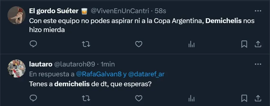 Otro de los fanáticos, con el usuario @tiagosig9, destacó que “ni el árbitro ni el VAR, ni los uruguayos ni nadie. El único rival que tiene River se llama Demichelis”, haciendo clara alusión de que el DT volvió a equivocarse en las decisiones que tomó a lo largo del tiempo reglamentario, y que terminó incidiendo en el resultado final.