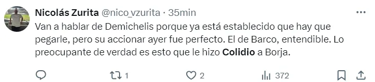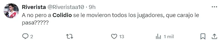 La imagen de Colidio no le gustó a los simpatizantes del Millonario, que se expresaron en las redes sociales. “Horrendo”, “asqueroso” y “preocupante” fueron algunos de los adjetivos que utilizaron los hinchas para referirse a esa situación.