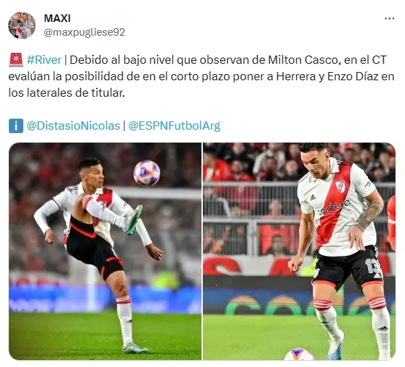 “Sé que en el CT evalúan que el momento de Casco hoy no está siendo el que pretenden. Si Herrera logra esa continuidad, no me sorprendería que en algún momento…”, soltó con algo de suspenso el periodista Nicolás Distasio en ESPN F12. Sería una rareza verlo al lateral fuera del once inicial, pero hoy es una posibilidad debido al buen momento de otros jugadores en dicha posición. Decide Demichelis.
