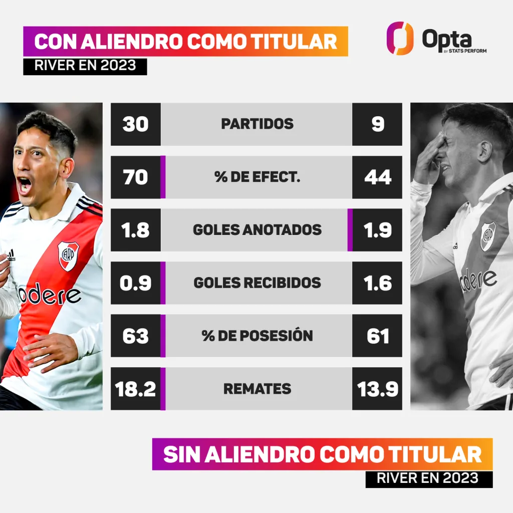 Sin el mediocampista, River bajó su porcentaje de puntos obtenidos (70% a 44%) a lo largo de sus encuentros oficiales del 2023. Mismo efecto causó en el promedio de remates del equipo de Demichelis, que disparó 18.2 veces por partido con Aliendro en el once titular y 13.9 por juego sin la presencia del volante en la planilla.