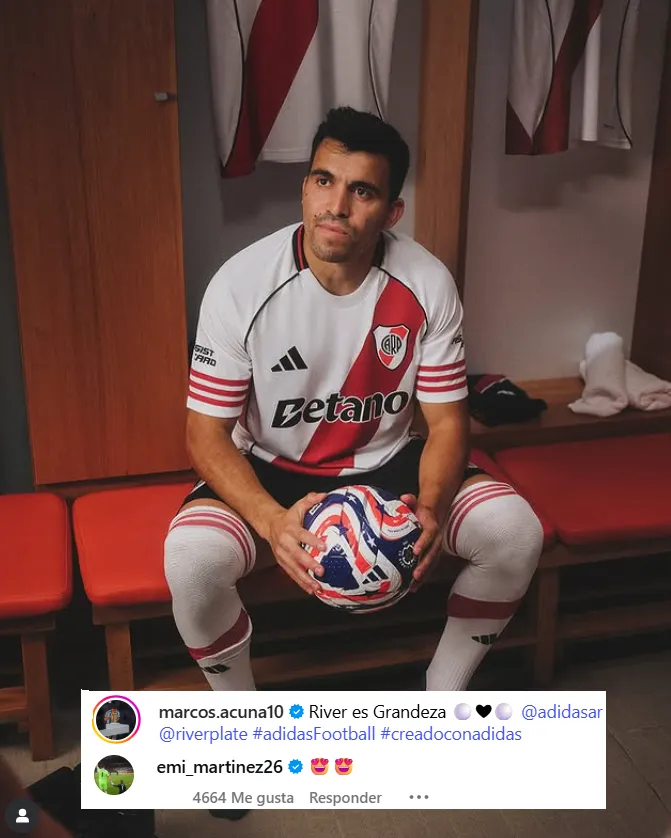 El pasado miércoles por la mañana, River dio a conocer de manera oficial su nueva indumentaria. Aquellos jugadores que tienen como sponsor a Adidas utilizaron sus redes sociales para posar con la nueva ropa, entre ellos aparece Marcos Acuña, quien usó su cuenta de Instagram para postear una foto con la nueva casaca titular, la misma se llenó de likes de hinchas del Millonario y también de comentarios, pero el que no pasó desapercibido fue el de Emiliano Martínez.