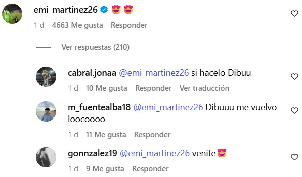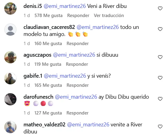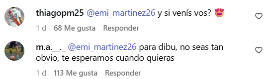 Dibu comentó desde su cuenta de Instagram dos emojis con ojos de corazones y eso desató la locura de los hinchas de River. Dicho comentario tuvo más de 4600 likes y unos 210 comentarios con un mensaje casi unánime: le pedían al arquero que venga. Cabe destacar que la relación de amistad entre el futbolista de Aston Villa con el lateral izquierdo viene por sus años compartidos en la Selección Argentina.