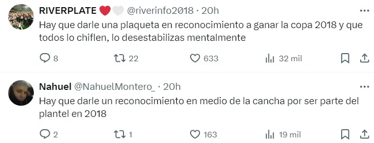 Con el fin de incomodarlo a él y su equipo, en las redes proponen esperarlo como a cualquier exfutbolista del club campeón. Quieren nombrarlo con la voz del estadio y darle una plaqueta por la Supercopa 2017 (fue titular contra el Xeneize en Mendoza) y su participación en la Libertadores que se terminó ganando en Madrid.