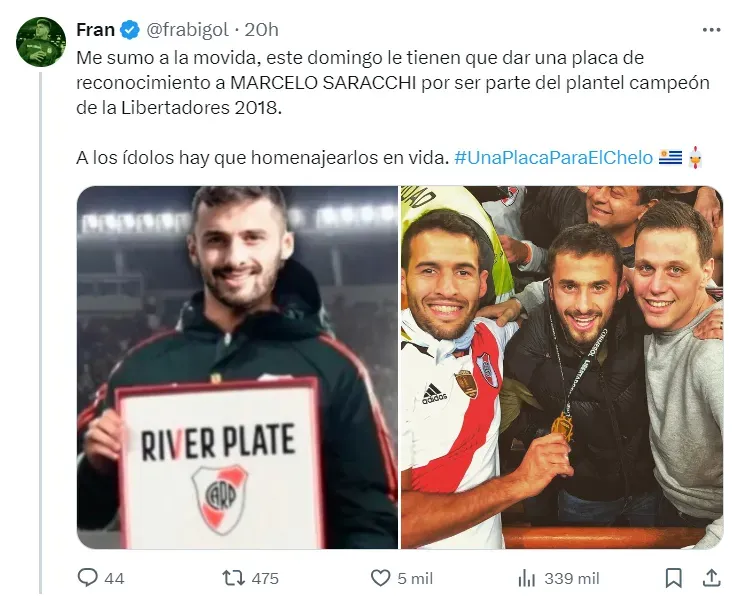 Cabe recordar que Saracchi, pese a que ya no estaba en el club en el día de la consagración, es considerado campeón de América. Durante el primer semestre de aquel año, el uruguayo fue titular en el equipo de Marcelo Gallardo y luego fue vendido al Lepizig por 12 millones de dólares.
