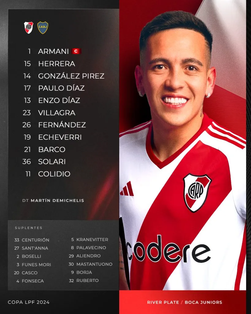 Para este encuentro, el Millonario sale a la cancha con: Franco Armani; Andrés Herrera, Leandro González Pírez, Paulo Díaz, Enzo Díaz; Rodrigo Villagra, Ignacio Fernández, Claudio Echeverri, Esequiel Barco, Pablo Solari y Facundo Colidio.