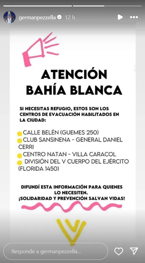 La siguiente historia fue de servicio. Allí compartió distintos refugios a los que puede ir la gente que lo necesita. “Atención Bahía Blanca, si necesitás refugio, estos son los centros de evacuación habilitados en la ciudad: Calle Belén (Güemes 250), Club Sansinena – General Daniel Cerri, Centro Natan – Villa Caracol, División del V cuerpo del ejército (Florida 1450). Dinfundí esta información para quienes lo necesiten. ¡Solidaridad y prevención salvan vidas!”.