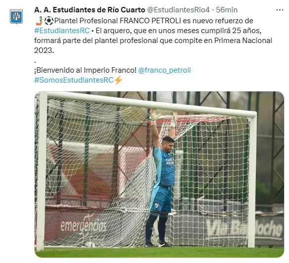 “Franco Petroli es nuevo refuerzo de Estudiantes RC. El arquero, que en unos meses cumplirá 25 años, formará parte del plantel profesional que compite en Primera Nacional 2023“, informó la institución de Córdoba a través de sus redes sociales para darle la bienvenida al futbolista que llega por la vía del préstamo para sumar minutos de forma profesional. En Núñez confían en que será un buen paso para su carrera.
