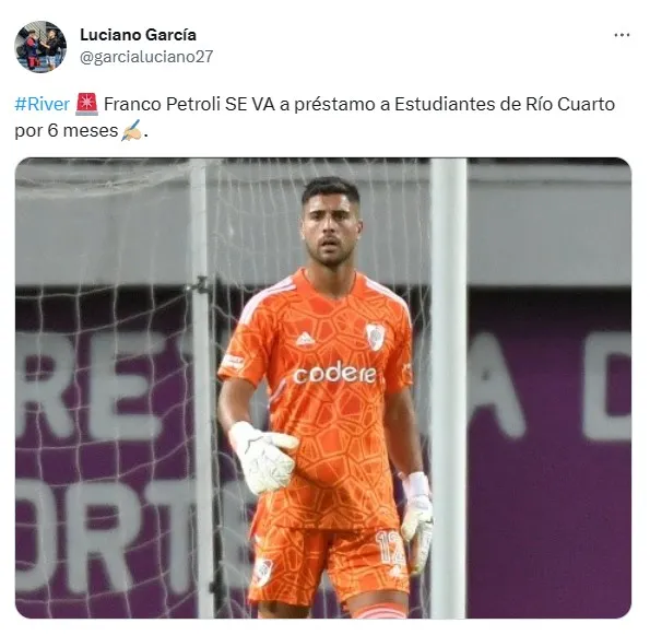 Según pudo confirmar el periodista de La Página Millonaria, Luciano García, Franco Petroli no seguirá en River y continuará su carrera en Estudiantes de Río Cuarto, club que integra la Primera Nacional. Con 15 suplencias en Primera y 89 partidos oficiales con la Reserva, el arquero se marchará sin haber debutado oficialmente más allá de algún amistoso de preparación.