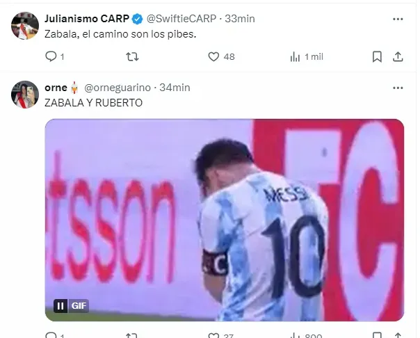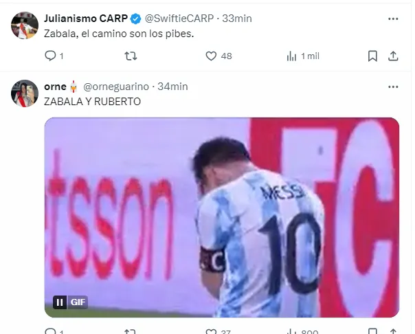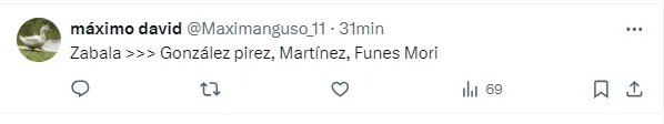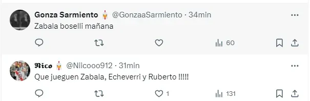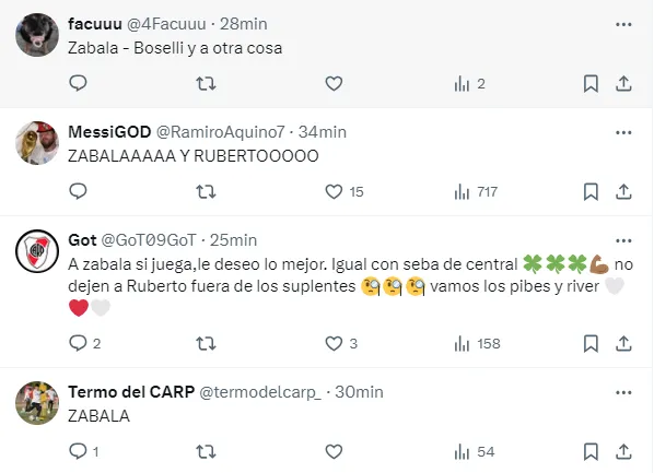 “Zabala, el camino son los pibes”, “Ni se les ocurra poner a Martínez antes que a Zabala”, “Zabala y Boselli mañana”, “Zabala – Boselli y a otra cosa”, “Zabala!!! Vamos”, fueron algunos de los comentarios de los fanáticos del equipo de Núñez pidiendo por el defensor central zurdo.