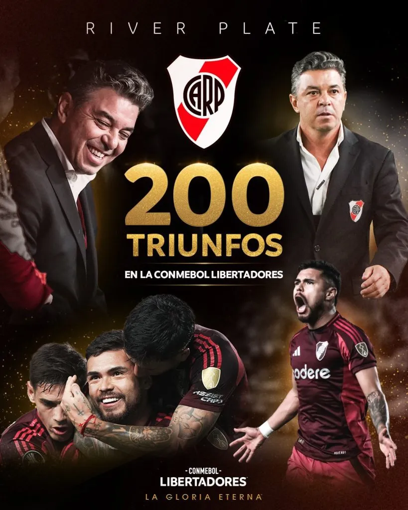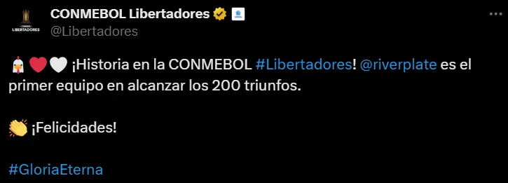 La casa madre del fútbol Sudamericano, a través de sus cuentas oficiales de la Copa Libertadores, aprovecharon para felicitar al Millonario por haber conseguido esta importante marca. “¡Historia en la CONMEBOL Libertadores! River Plate es el primer equipo en alcanzar los 200 triunfos. ¡Felicidades!”. Además, acompañaron el posteo con una foto en la que se pueden observar algunas imágenes de la victoria del pasado miércoles con Marcelo Gallardo y Paulo Díaz como protagonistas.
