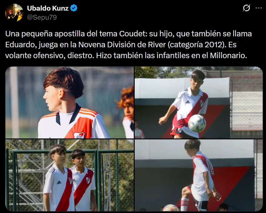 - El hijo de Eduardo Coudet juega actualmente como volante en la Novena División de River.