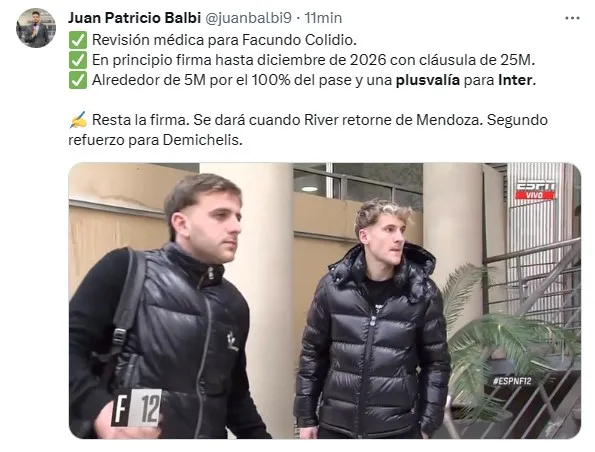 Tras anunciar a Ramiro Funes Mori como primera incorporación en el presente mercado de pases, River trabaja a contrarreloj para cerrar la flamante llegada de Facundo Colidio. El exjugador de Tigre aceptó la propuesta del Millonario por sobre la de Boca y es cuestión de tiempo para que se formalice su arribo. Sin embargo, todavía existen detalles a pulir con el Inter de Milán.