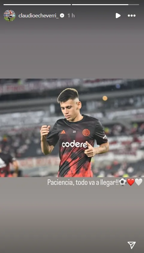 Echeverri es activo en las redes sociales y en esta oportunidad utilizó su cuenta de Instagram tras la victoria por 2 a 0 del Millonario ante Independiente Rivadavia en el Monumental. El Diablito compartió una foto suya del precalentamiento y lo acompañó con un mensaje que bien podría ser para él mismo como también para los hinchas: “Paciencia, todo va a llegar”, acompañado de una pelota y dos corazones: uno blanco y otro rojo.