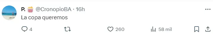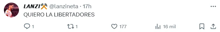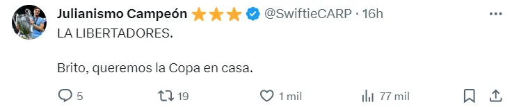 “Brito, queremos la copa en casa”, “no se nos puede escapar” y “quiero la Libertadores” fueron algunos de los tantos mensajes que recibió Brito en su cuenta de X (Twitter). El gran objetivo del 2024 será jugar los 13 partidos del certamen continental.