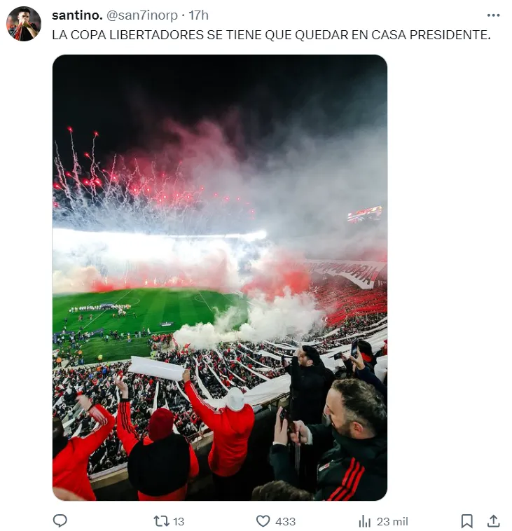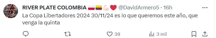 Si bien los simpatizantes se mostraron entusiasmados por la noticia, la mayoría de las respuestas para el principal dirigente del Millonario tenían que ver con un pedido especial: consagrarse campeones de la próxima CONMEBOL Libertadores, cuya final se llevará a cabo precisamente en Núñez.