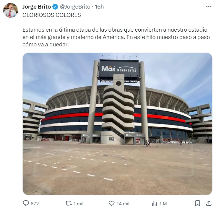 “El estado más grande y moderno de América”. Así presentó Jorge Brito las imágenes de cómo quedará el Monumental una vez finalizadas las obras. El presidente de River confirmó que están en la última etapa de las obras de renovación de la cancha y sus redes sociales se llenaron de comentarios.