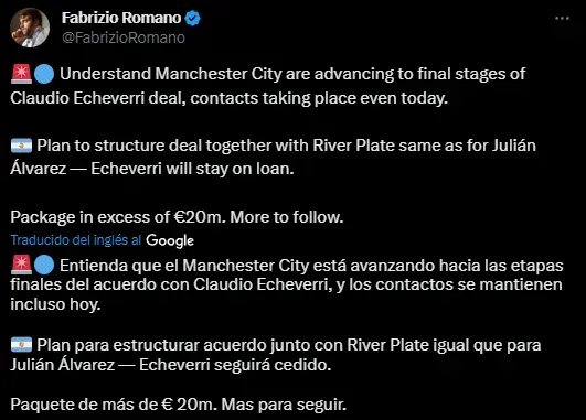 Según informó el periodista Fabrizio Romano, el conjunto inglés ya entabló charlas con el Millonario y con el entorno de Claudio Echeverri, y en las últimas horas, las mismas se intensificaron fuertemente, ya que los Citizens llegaron a Núñez con una oferta y un plan concreto.