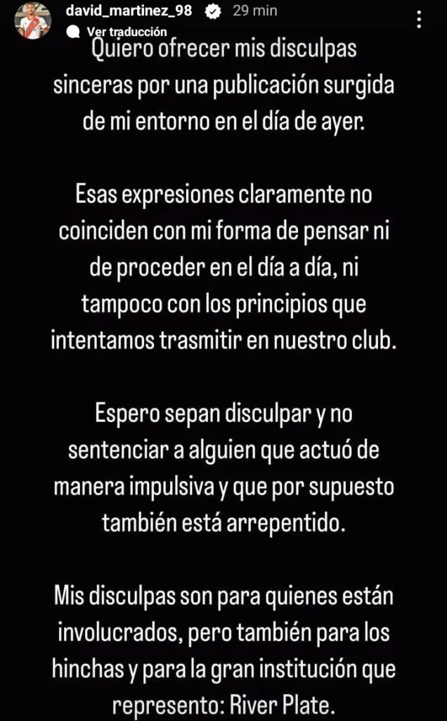 Por medio de un posteo de Instagram, Martínez buscó bajar la temperatura que provocaron los dichos de su hermano, y escribió: “Quiero ofrecer mis disculpas sinceras por una publicación surgida de mi entorno en el día de ayer. Esas expresiones claramente no coinciden con mi forma de pensar ni proceder en el día a día, ni tampoco con los principios que intentamos transmitir en nuestro club”.