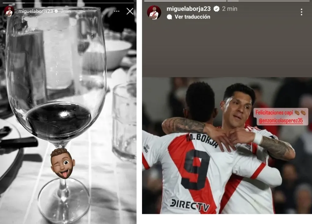 Pocos minutos después de la consagratoria serie de penales de Matías Mansilla que le dio el pase al Pincha a la final, el goleador del Millonario subió dos historias. La primera de ellas, tomándose un vino, como si estuviera cerrando una buena noche…