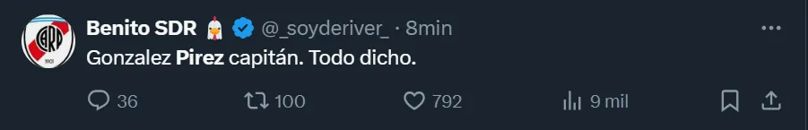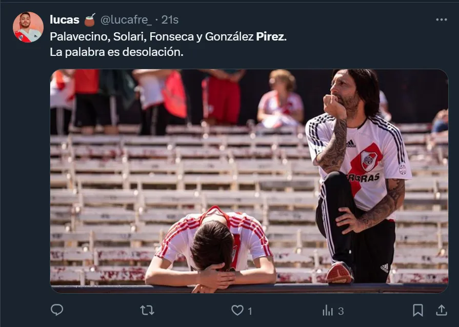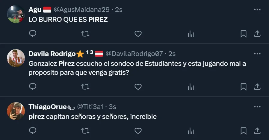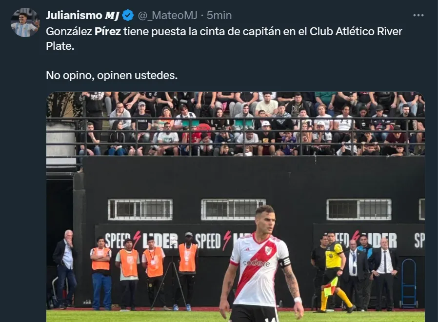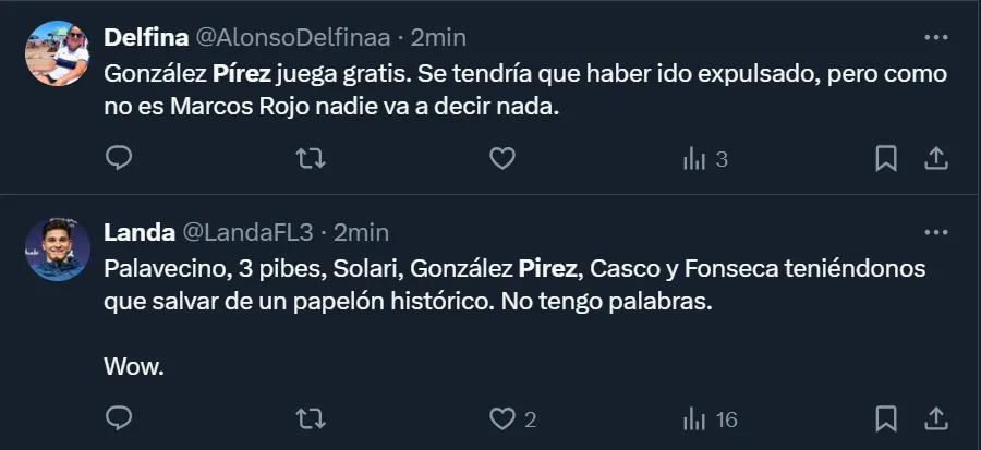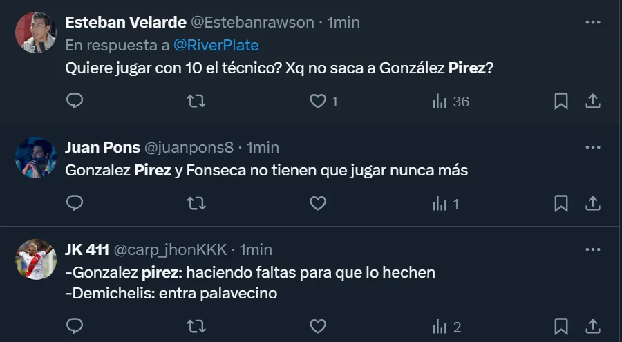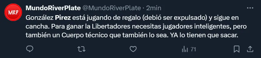 A través de X, la ex Twitter, el usuario @MundoRiverPlate destacó que “González Pirez está jugando de regalo (debió ser expulsado) y sigue en cancha. Para ganar la Libertadores necesitas jugadores inteligentes, pero también un cuerpo técnico que también lo sea. Ya lo tienen que sacar”. Pero no fue el único que criticó el nivel del ex Atlanta United.