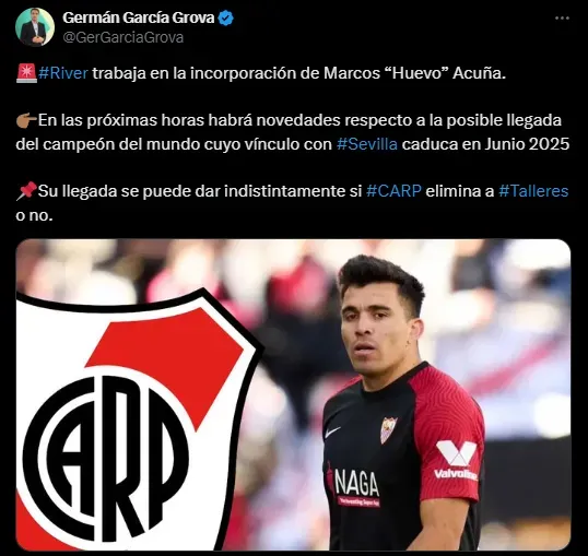 Según informó el periodista Germán García Grova, River tiene negociaciones avanzadas para contratar a Marcos “Huevo” Acuña. El lateral izquierdo con pasado en Ferro, Racing, Sporting Lisboa y con presente en Sevilla tenía las de salir en este mercado de pases debido a que es considerado prescindible para el conjunto español.