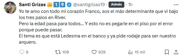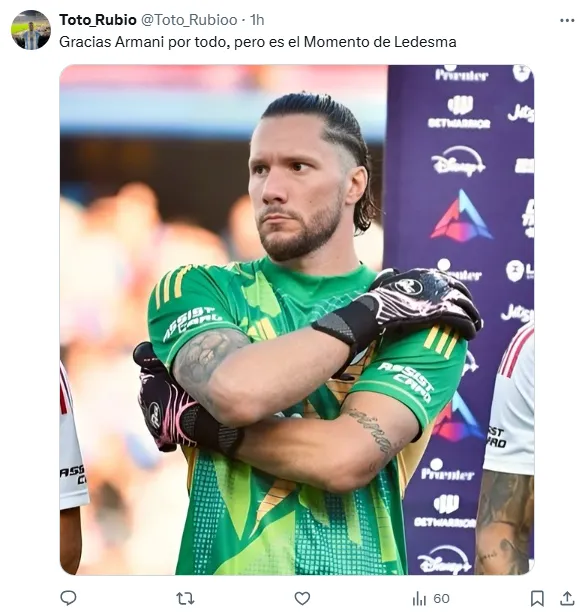 Los hinchas de River hicieron tendencia a Jeremías “Conan” Ledesma, el arquero que llegó en el mercado de pases de invierno de 2024. Para muchos, el ex-Cadiz y Rosario Central merece una chance como titular, por más que esto signifique mandar al campeón del mundo al banco de suplentes.