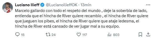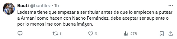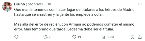 “Adentro Ledesma”, “ya pide rodaje”, “es el momento”, “debe ser el titular“, fueron algunos de los comentarios de los simpatizantes del Millonario en la red social ‘X’. Hasta el momento, el futbolista de 31 años solo fue de arranque en equipos alternativos o cuando el Pulpo no estuvo disponible.
