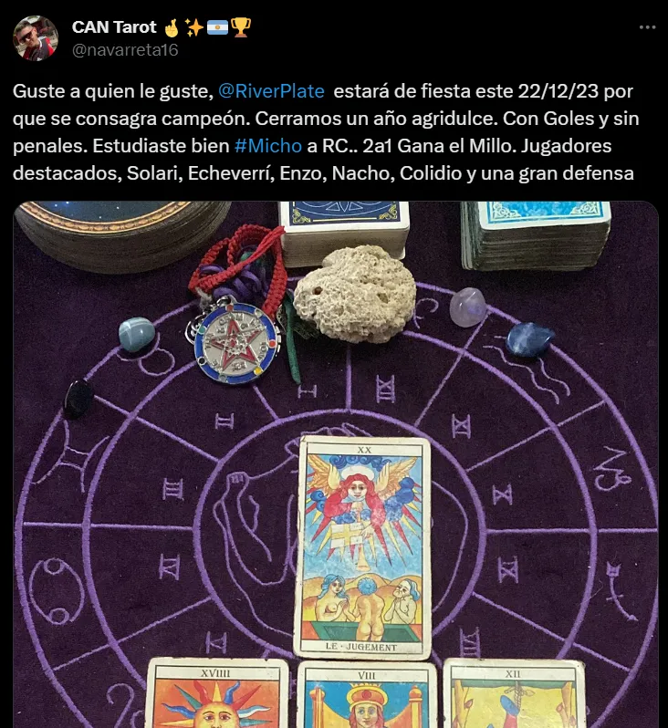 Por intermedio de las redes sociales, @navarreta16 no dio demasiados rodeos en torno a quién se quedará con el título: el equipo Millonario. Sintetizando, el tarotista aseguró que los de Demichelis se impondrán por 2-1 contra Rosario Central y festejarán a lo grande, cerrando el año con un título que despejará todas las dudas.