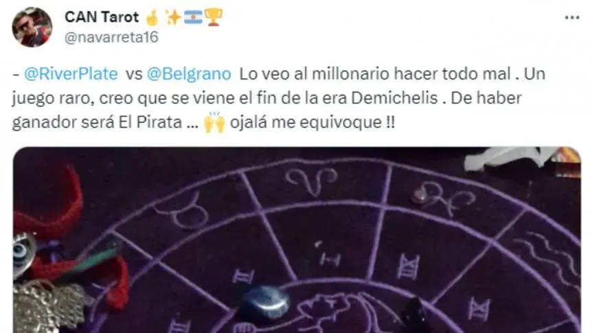 Dentro del territorio riverplatense, el tarotista que en Twitter es conocido como @navarreta16, ha vaticinado diferentes resultados y en su gran mayoría sucedió lo que comentó por redes sociales. Por eso mismo, ahora se generó un enorme revuelo, ya que anunció lo que ocurrirá con el duelo entre el Millo y Belgrano, correspondiente a los cuartos de final de la Copa de la Liga Profesional.