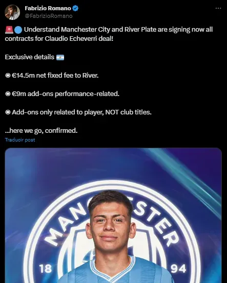 Hoy, que solamente resta la revisión médica para que Echeverri firme contrato con el City, se conocieron los montos finales de la operación que hará mudar al chaqueño desde Núñez o Manchester. Según confirmó el periodista Fabrizio Romano, el equipo dirigido por Pep Guardiola terminó adquiriendo su ficha en 14.5 millones de euros.