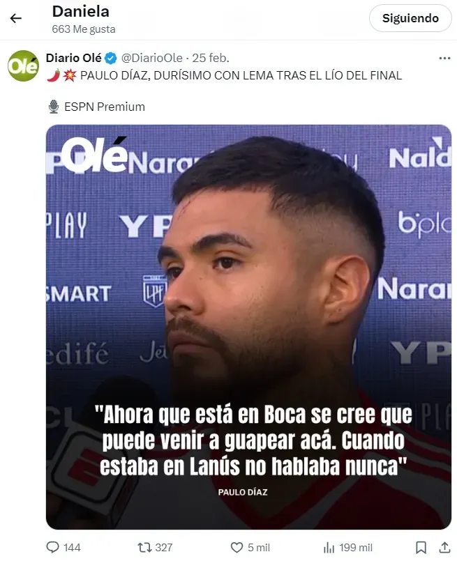 El tuit no fue el único mensaje de Rendón en sus redes, ya que también se despachó con un “me gusta” para un tuit con las palabras de Paulo Díaz, quien cuestionó a Lema por la discusión que mantuvo al final del encuentro. ¿Habrá nuevo cruce en el próximo Superclásico?