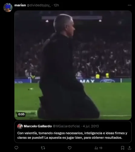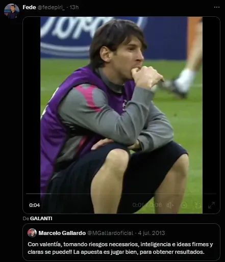 En 2013, cuando el Muñeco ni siquiera se había convertido en entrenador de River y utilizaba su cuenta de Twitter, expresó una frase sobre su idea de juego, que luego plasmaría en su multicampeón ciclo en el Millonario: “Con valentía, tomando riesgos necesarios, inteligencia e ideas firmes y claras se puede!! La apuesta es jugar bien, para obtener resultados“, esbozaba el Gallardo de 2013 escuetos 140 caracteres.