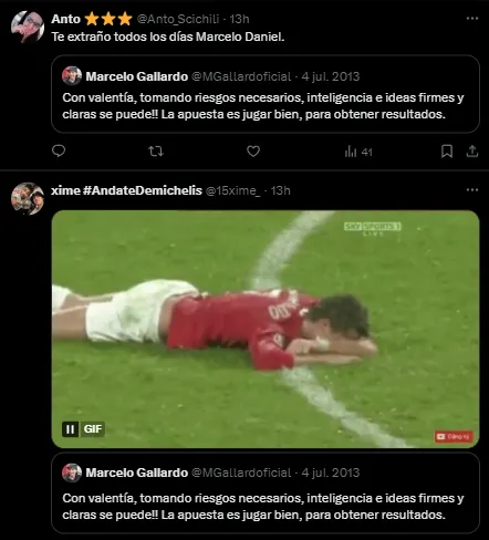 Tanto en redes sociales como entre los neutrales que estuvieron presentes en Mendoza ante Godoy Cruz mostraron su disconformidad con Demichelis y el plantel y hasta exigieron que se le ponga un fin al ciclo del DT en el club. Incluso, muchos hinchas riverplatenses se cruzaron en X (ex Twitter) con un viejo tuit de Marcelo Gallardo que no tardaron en replicar.