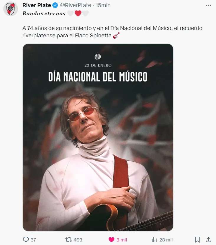 “Bandas eternas. A 74 años de su nacimiento y en el Día Nacional del Músico, el recuerdo riverplatense para el Flaco Spinetta”, escribió el Millonario en su cuenta oficial de X. El emotivo mensaje estuvo acompañado de una foto del músico con una polera blanca y una guitarra colgada con una correa roja, la cual formaba el clásico dibujo de la camiseta de River.