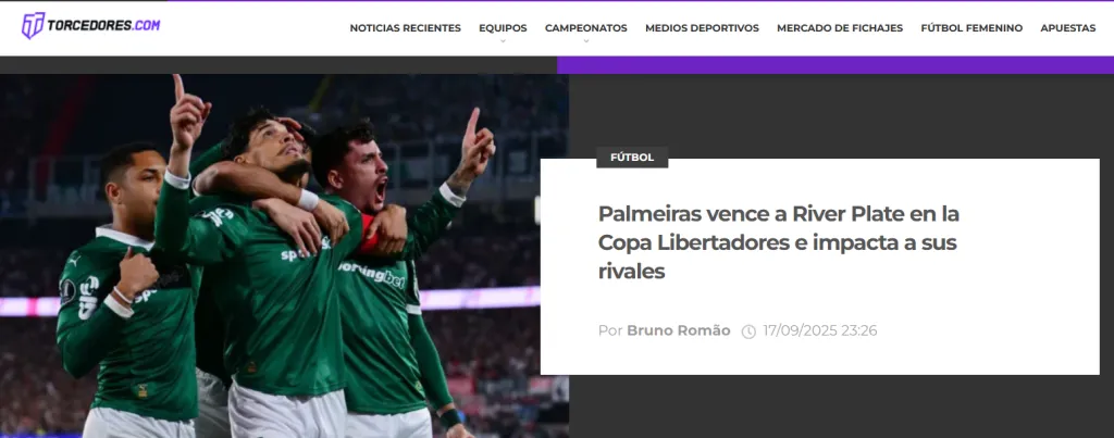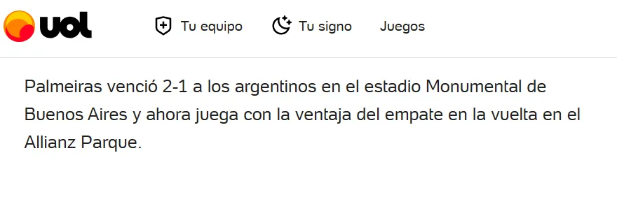 UOL, por su lado, también destaca los dos marcadores que los brasileños tendrán de su lado para eliminar al Millonario: ”Palmeiras venció 2-1 a los argentinos en el estadio Monumental de Buenos Aires y ahora juega con la ventaja del empate en la vuelta en el Allianz Parque”.