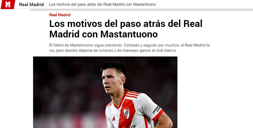 La negociación que River y Real Madrid mantenían desde hace semanas por Franco Mastantuono, aparentemente, se habría enfriado. Por lo menos así lo apunta el diario Marca de España con una llamativa publicación destacada en su sitio web este domingo primero de septiembre, jornada en la que la atención debería estar en el partido que el Merengue debe ganarle al Real Betis para no perderle pisada al Barcelona en la tabla de LaLiga.