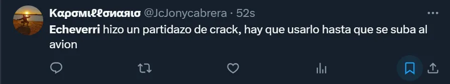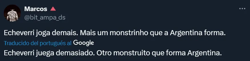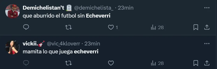 Como si fuese poco, el Diablito se dio el lujo de tirarle un excelso caño al mítico Roque Santa Cruz, quien quedó pintado en tres cuartos del campo donde estaba atacando el cuadro paraguayo. Y por su actuación, los hinchas que observaron el encuentro por televisión, llenaron de elogios al 19: “Echeverri en 2031 ganará el Balón de Oro”, aseveró el usuario de Twitter @rafaeldogueto7m. Pero no fue el único que destacó la performance.