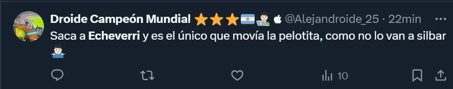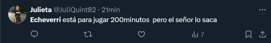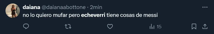 En la misma red social, @daianaabottone también se mostró eufórica con el desempeño que tuvo el futbolista que fue reemplazado tras afrontar 69 minutos: “No lo quiero mufar, pero Echeverri tiene cosas de Messi”. Sin duda alguna, tuvo una noche majestuosa, y desde las tribunas se lo hicieron notar.