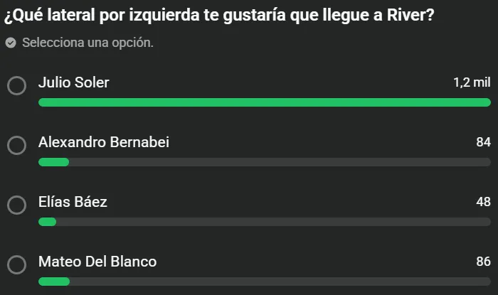 A través de su canal de WhatsApp, Bolavip propuso una encuesta para que los hinchas de River elijan a cuál de los cuatro laterales por izquierda que sonaron este mercado de pases prefieren. Los resultados fueron apabullantes: más de 1200 fanáticos votaron por Julio Soler, apenas 86 por Mateo Del Blanco, 84 lo hicieron por Alexandro Bernabei y solamente 48 por Elías Báez.
