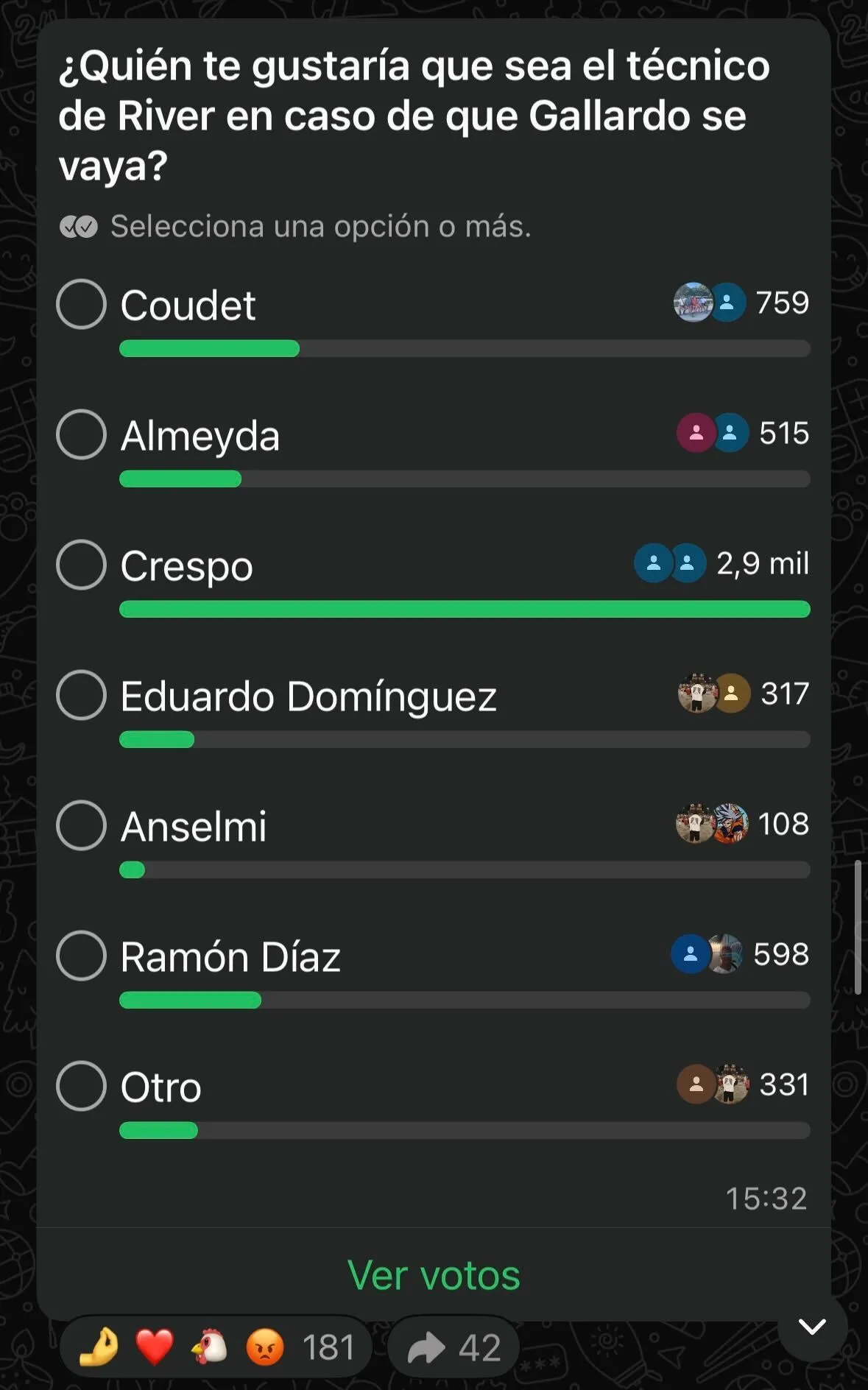 Bolavip propuso una encuesta en su canal de WhatsApp en la que les propuso a los hinchas elegir a un hipotético sucesor de Marcelo Gallardo, siempre y cuando el Muñeco decida dar un paso al costado. Entre las opciones aparecieron nombres de verdaderos ídolos del club como es el caso de Ramón Díaz, también de ex jugadores muy respetados y que tienen ya su recorrido como entrenadores como Hernán Crespo, Eduardo Coudet y Matías Almeyda.