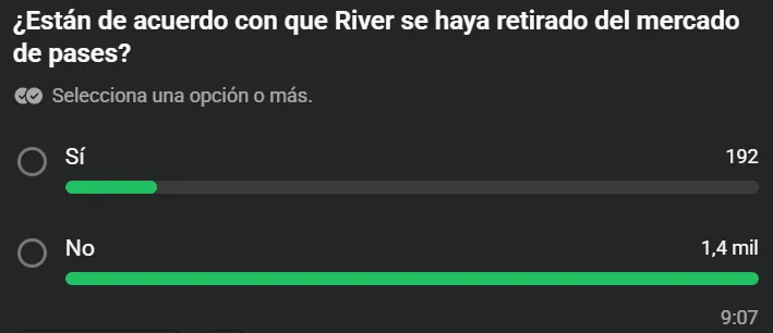 En una encuesta propuesta por Bolavip en su canal de WhatsApp –River Plate Fans– los hinchas fueron contundentes al ser consultados si estaban de acuerdo o no respecto a la decisión de retirarse del mercado de pases. Más de 1400 votos recibió el no, mientras que apenas 192 respondieron que sí.