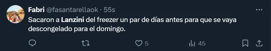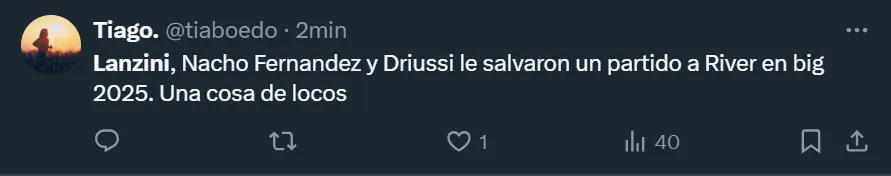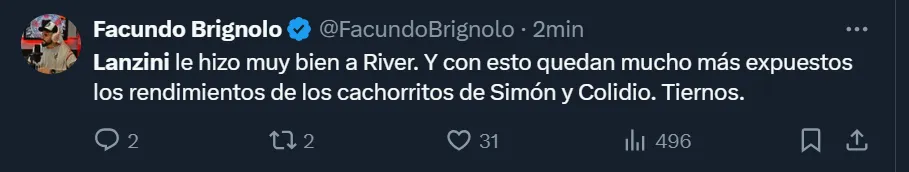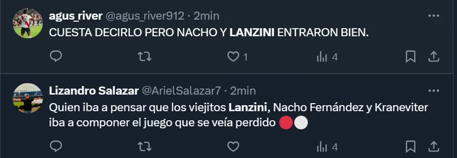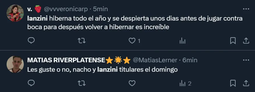 A través de las redes sociales, los comentarios de los hinchas riverplatenses se viralizaron en todo momento. Principalmente, por la actuación de la primera mitad, donde a los de Gallardo les anotaron dos goles prácticamente idénticos. Y como se notó una mejora en el complemento, a partir del ingreso de Manuel Lanzini, en Twitter solicitaron que el domingo sea titular.