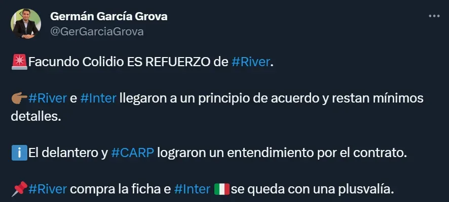 En las últimas horas, fue el periodista Germán García Grova quien confirmó que River llegó a un principio de acuerdo con Inter de Milán para que Facundo Colidio se transforme en el segundo refuerzo. “Restan mínimos detalles”, aseveró en su cuenta de Twitter.