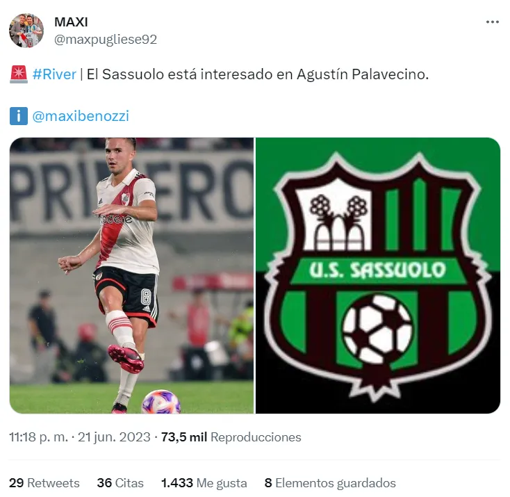 El mercado de pases de Europa todavía no empezó, pero parece que desde Italia están poniendo los ojos en más de un hombre del Millonario. Así como hace unos días Beltrán apareció en el radar de grandes de la Serie A, ahora otro equipo de esa liga se interesa en Agustín Palavecino.