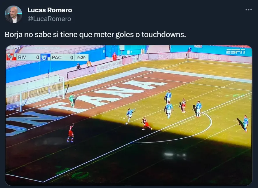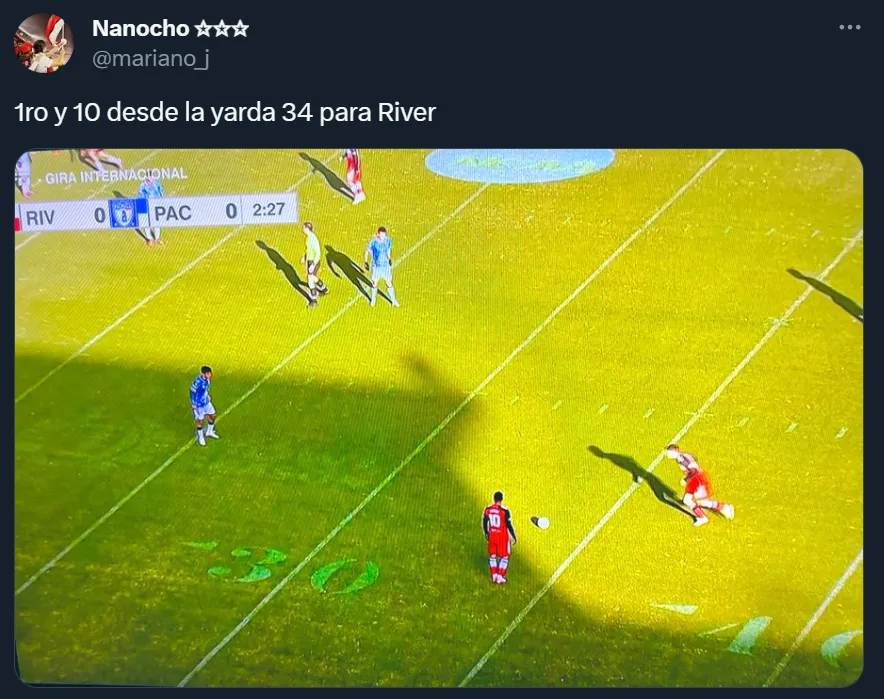 Resulta que el terreno estaba delimitado para afrontar encuentros correspondientes a la NFL, por lo que tuvieron que marcar las líneas de cal por encima de las que ya se encontraban. Y los fanáticos de River, principalmente, aprovecharon cuestionar el hecho, dado a que por momentos no comprendían dónde empezaba un escenario y dónde terminaba el otro.