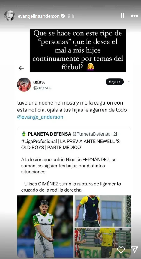 Esta vez, la esposa de Micho expuso a un simpatizante que le deseó el mal a sus hijos. “Ojalá que a tus hijas le agarren de todo @evange_anderson”, escribió un usuario tras enterarse de la lesión de Ulises Giménez, futbolista que el Millonario tiene a préstamo en Defensa y Justicia.